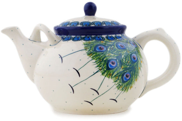 This Polish pottery Tea or Coffee Pot is made by Ceramika Artystyczna workshop in Boleslawiec, Poland. Manufacturer item number H5970Q. It is 6¾" high and measures 11" by 7¼". The capacity of this Tea or Coffee Pot is 60.8 oz when filled to rim and it weighs 2.7 lbs. It is part of the Majestic Peacock Collection.