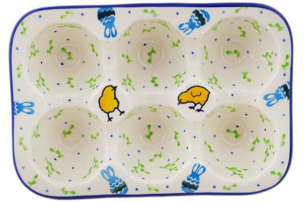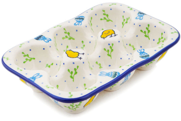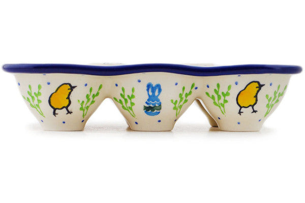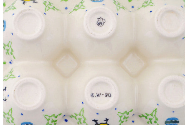 This Polish pottery Egg Crate is made by Ceramika Artystyczna workshop in Boleslawiec, Poland. Manufacturer item number H1357R. It is 1½" high and measures 7" by 4¾". The capacity of this Egg Crate is 6.8 oz when filled to rim and it weighs 0.8 lbs. It is part of the Easter Day Collection.