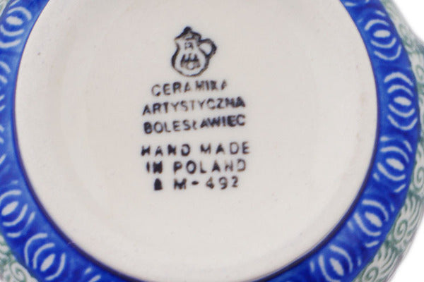 This Polish pottery Creamer is made by Ceramika Artystyczna workshop in Boleslawiec, Poland. Manufacturer item number H5794Q. It is 3" high and measures 3¾" by 3". The capacity of this Creamer is 6.8 oz when filled to rim and it weighs 0.4 lbs. The pattern was designed by artist Irena Mączka. It is part of the Scarlet Pimpernel Flower Collection.