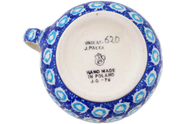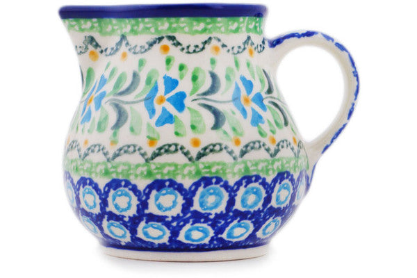 This Polish pottery Creamer is made by Ceramika Artystyczna workshop in Boleslawiec, Poland. Manufacturer item number H3498A. It is 3" high and measures 3¾" by 3". The capacity of this Creamer is 6.8 oz when filled to rim and it weighs 0.4 lbs. The pattern was designed by artist Janina Pałka. It is part of the Top Of The Morning Collection.