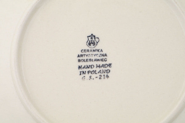 This Polish pottery Plate is made by Ceramika Artystyczna workshop in Boleslawiec, Poland. Manufacturer item number H1431Q. It is ¾" high and measures 7½" by 7½". The weight of this Plate is 1.0 lbs. The pattern was designed by artist Jolanta Okraska. It is part of the Feathery Bluebells Collection.