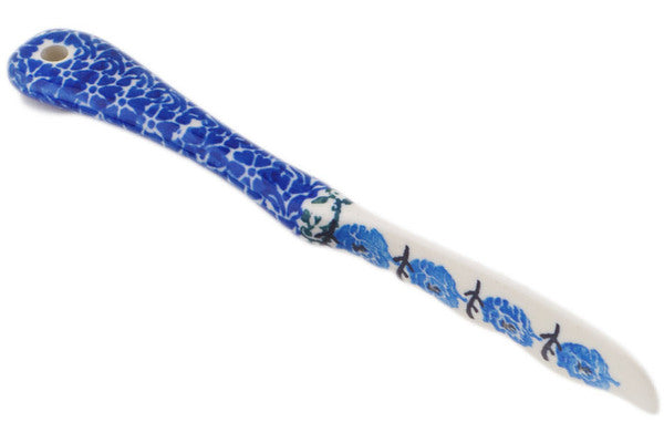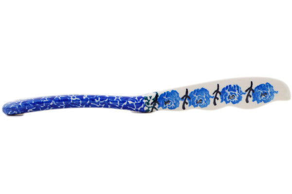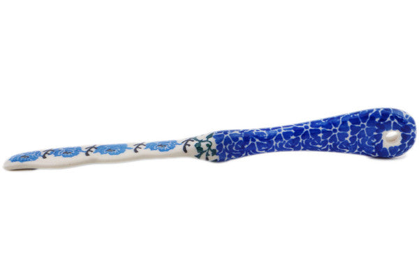 This Polish pottery Spreading Knife is made by Ceramika Artystyczna workshop in Boleslawiec, Poland. Manufacturer item number H5589Q. It is 1" high and measures 7¼" by 1". The weight of this Spreading Knife is 0.1 lbs. The pattern was designed by artist Teresa Liana. It is part of the Blue Rosette Wreath Collection.