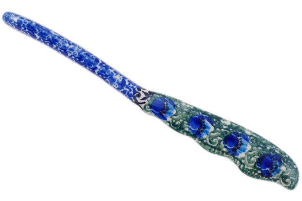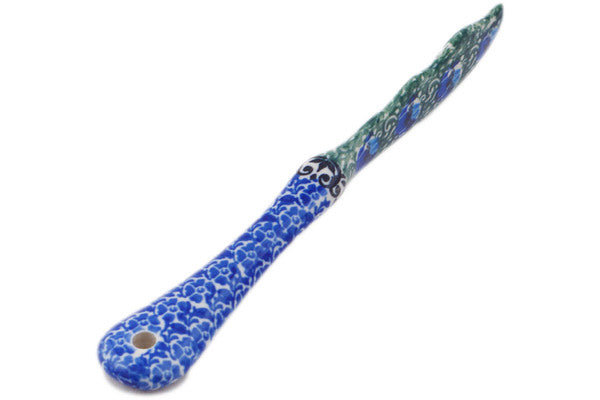 This Polish pottery Spreading Knife is made by Ceramika Artystyczna workshop in Boleslawiec, Poland. Manufacturer item number H5373Q. It is 1" high and measures 7¼" by 1". The weight of this Spreading Knife is 0.1 lbs. The pattern was designed by artist Teresa Liana. It is part of the Emerald Tulips Collection.