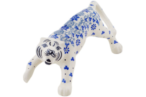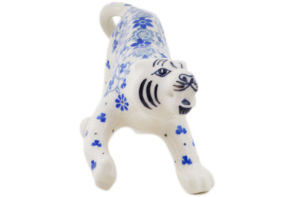This Polish pottery Tiger Figurine is made by Ceramika Artystyczna workshop in Boleslawiec, Poland. Manufacturer item number H0365Q. It is 3" high and measures 7¼" by 3½". The weight of this Tiger Figurine is 0.5 lbs. The pattern was designed by artist Maria Starzyk. It is part of the Blue Country Field Collection.