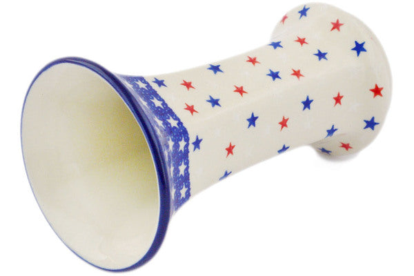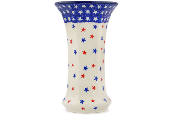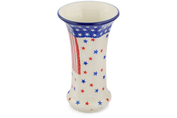 This Polish pottery Vase is made by Ceramika Artystyczna workshop in Boleslawiec, Poland. Manufacturer item number H2755R. It is 7" high and measures 4¼" by 4¼". The weight of this Vase is 1.0 lbs. It is part of the American Stars And Stripes Collection.