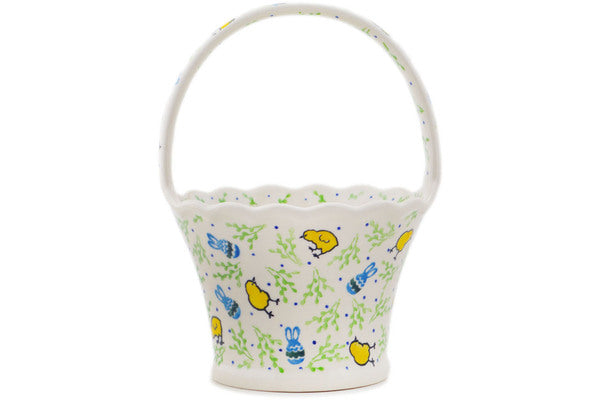 This Polish pottery Basket with Handle is made by Ceramika Artystyczna workshop in Boleslawiec, Poland. Manufacturer item number H9169Q. It is 8½" high and measures 6" by 6". The weight of this Basket with Handle is 1.6 lbs. It is part of the Easter Day Collection.