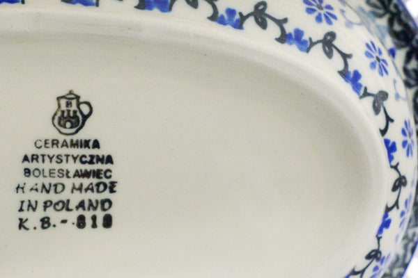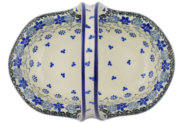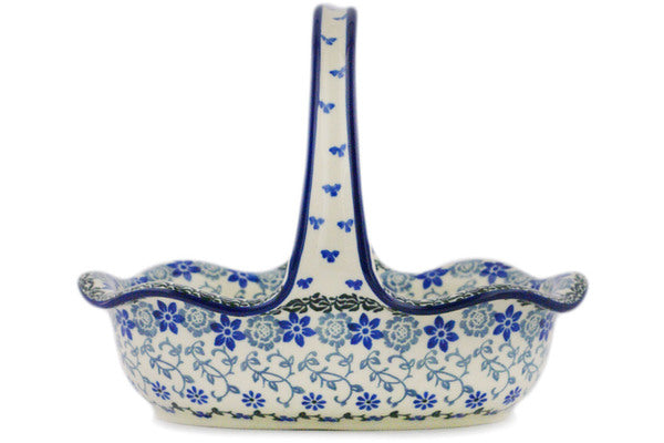 This Polish pottery Basket with Handle is made by Ceramika Artystyczna workshop in Boleslawiec, Poland. Manufacturer item number H6007Q. It is 7" high and measures 8¼" by 5¾". The weight of this Basket with Handle is 1.4 lbs. It is part of the First Snow Collection.