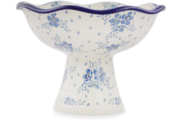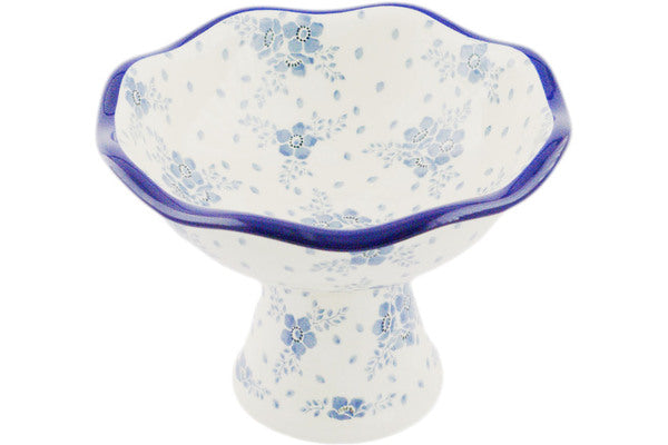 This Polish pottery Bowl with Pedestal is made by Ceramika Artystyczna workshop in Boleslawiec, Poland. Manufacturer item number H6249Q. It is 5¼" high and measures 8" by 8". The capacity of this Bowl with Pedestal is 30.4 oz when filled to rim and it weighs 1.7 lbs. It is part of the Rain Clouds Collection.