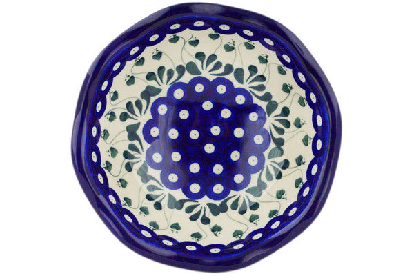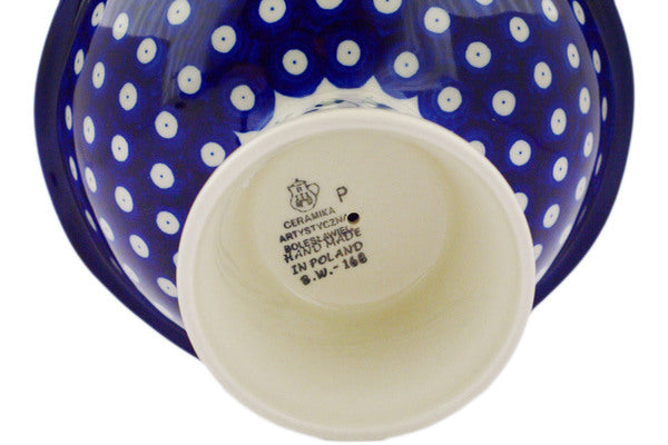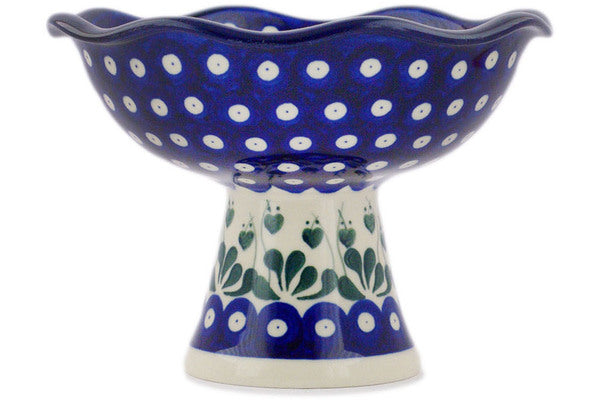 This Polish pottery Bowl with Pedestal is made by Ceramika Artystyczna workshop in Boleslawiec, Poland. Manufacturer item number H4903Q. It is 5¼" high and measures 8" by 8". The capacity of this Bowl with Pedestal is 30.4 oz when filled to rim and it weighs 1.7 lbs. The pattern was designed by artist Maria Ciszewska. It is part of the Bleeding Heart Peacock Collection.