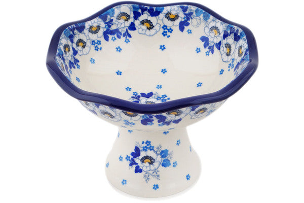 This Polish pottery Bowl with Pedestal is made by Ceramika Artystyczna workshop in Boleslawiec, Poland. Manufacturer item number H6105Q. It is 5¼" high and measures 8" by 8". The capacity of this Bowl with Pedestal is 30.4 oz when filled to rim and it weighs 1.7 lbs. It is part of the Blue Spring Collection.