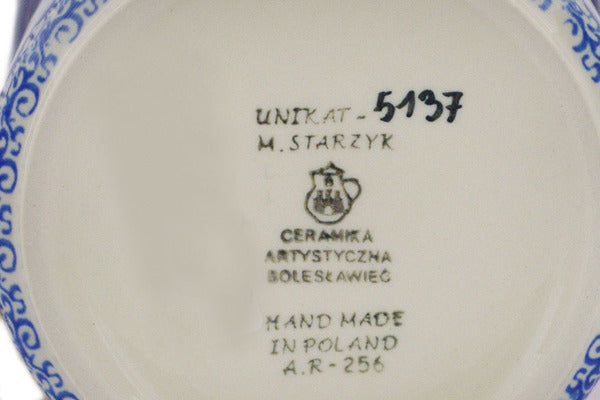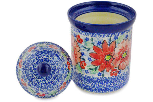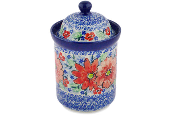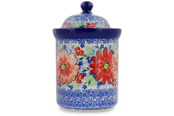 This Polish pottery Cookie Jar is made by Ceramika Artystyczna workshop in Boleslawiec, Poland. Manufacturer item number H7232Q. It is 7¾" high and measures 5" by 5". The capacity of this Cookie Jar is 33.8 oz when filled to rim and it weighs 1.9 lbs. It is part of the Peak Of Perfection Collection.