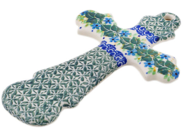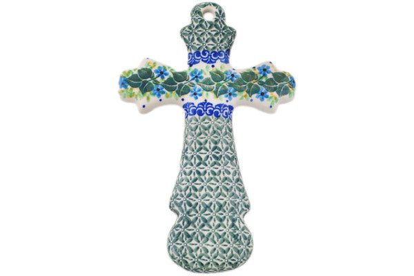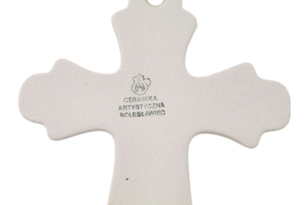 This Polish pottery Cross is made by Ceramika Artystyczna workshop in Boleslawiec, Poland. Manufacturer item number H5771Q. It is ½" high and measures 7¾" by 5". The weight of this Cross is 0.5 lbs. The pattern was designed by artist Barbara Fidelus. It is part of the Leaf Wreath Collection.