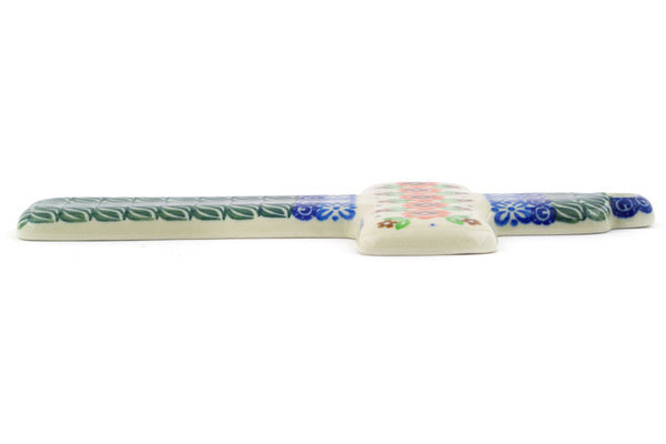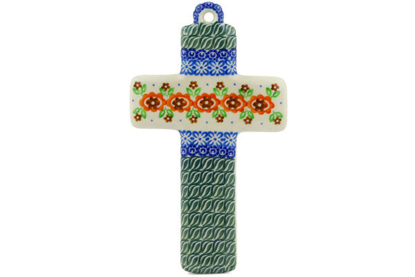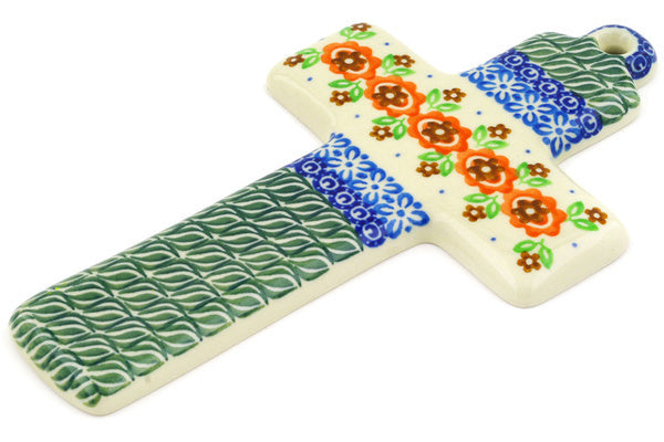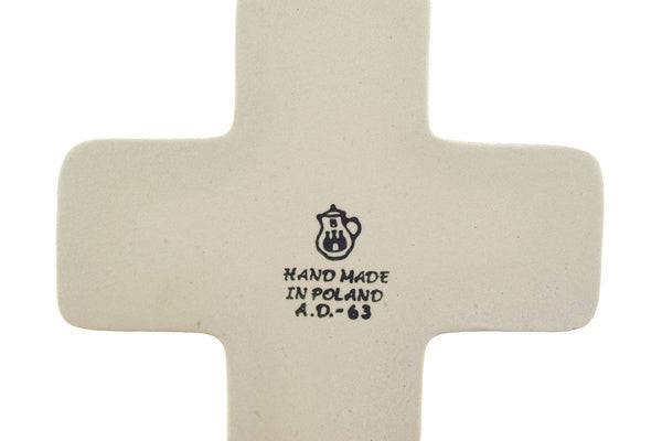 This Polish pottery Cross is made by Ceramika Artystyczna workshop in Boleslawiec, Poland. Manufacturer item number H6295E. It is 8½" high and measures 8¼" by 4¾". The weight of this Cross is 0.6 lbs. The pattern was designed by artist Barbara Fidelus. It is part of the Peach Daisy Collection.