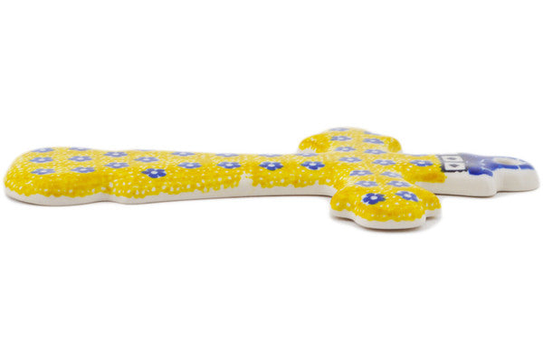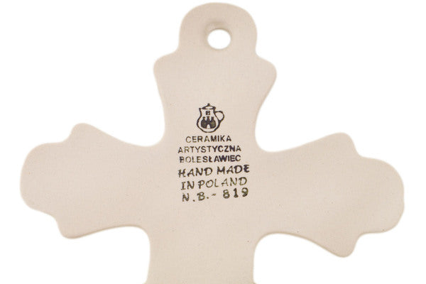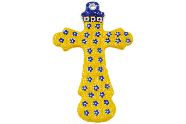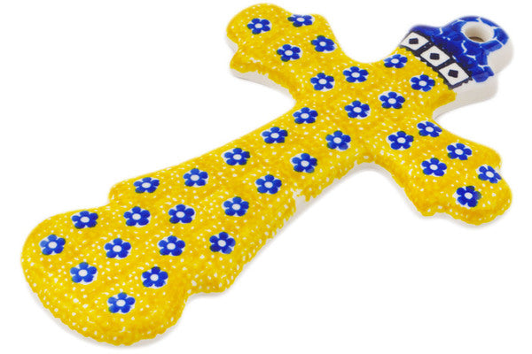 This Polish pottery Cross is made by Ceramika Artystyczna workshop in Boleslawiec, Poland. Manufacturer item number H5086Q. It is ½" high and measures 7¾" by 5". The weight of this Cross is 0.5 lbs. The pattern was designed by artist Teresa Liana. It is part of the Sunburst Daisies Collection.