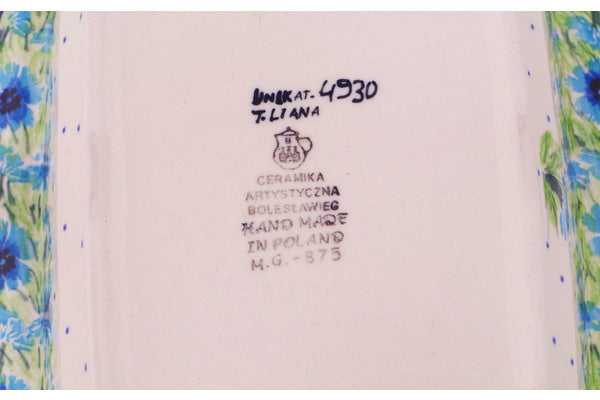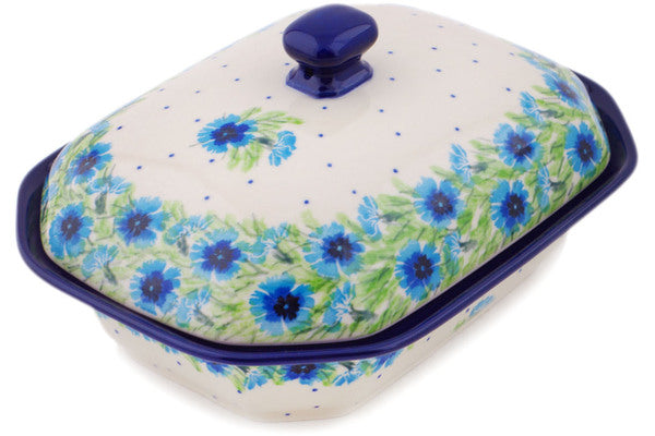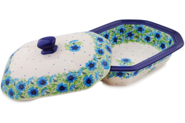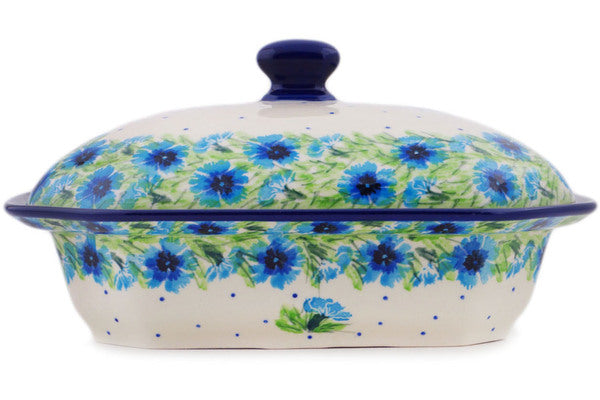 This Polish pottery Dish with Cover is made by Ceramika Artystyczna workshop in Boleslawiec, Poland. Manufacturer item number H2447Q. It is 4¼" high and measures 8¼" by 6½". The capacity of this Dish with Cover is 20.5 oz when filled to rim and it weighs 2.2 lbs. The pattern was designed by artist TERESA LIANA. It is part of the Springing Into Spring Collection.