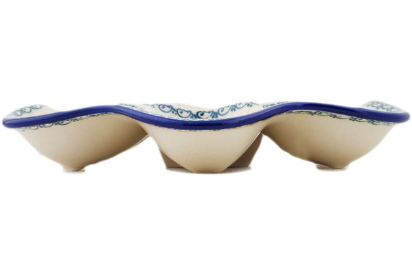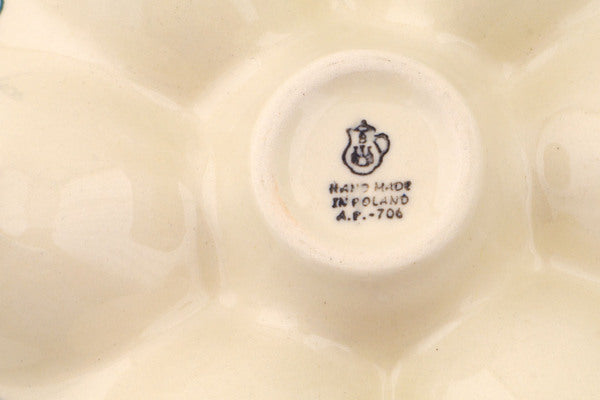 This Polish pottery Egg Plate is made by Ceramika Artystyczna workshop in Boleslawiec, Poland. Manufacturer item number H9094Q. It is 1¼" high and measures 8¼" by 8¼". The weight of this Egg Plate is 1.0 lbs. It is part of the Egg Hunt Collection.