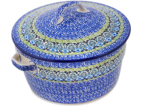 This Polish pottery Baker with Cover with Handles is made by Ceramika Artystyczna workshop in Boleslawiec, Poland. Manufacturer item number H5690Q. It is 6" high and measures 9½" by 8". The capacity of this Baker with Cover with Handles is 71.8 oz when filled to rim and it weighs 4.3 lbs. The pattern was designed by artist Maria Starzyk. It is part of the Artistic Boho Collection.