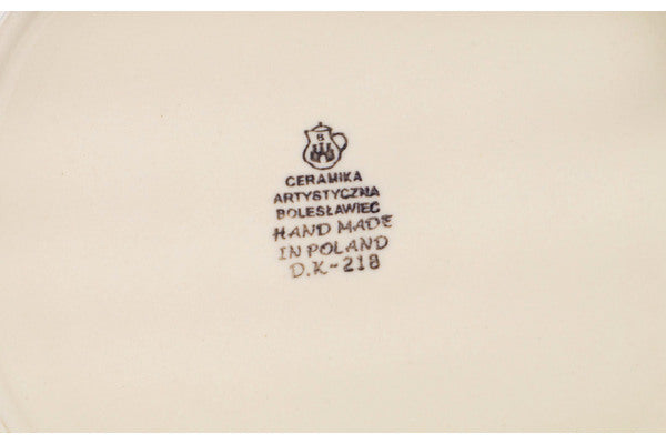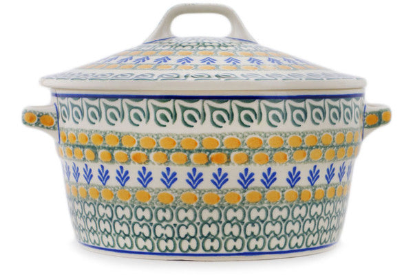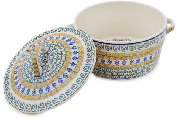 This Polish pottery Baker with Cover with Handles is made by Ceramika Artystyczna workshop in Boleslawiec, Poland. Manufacturer item number H5346Q. It is 6" high and measures 9½" by 8". The capacity of this Baker with Cover with Handles is 71.8 oz when filled to rim and it weighs 4.3 lbs. The pattern was designed by artist Anna Pasierbiewicz. It is part of the Autumn Wheatfields Collection.