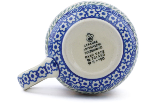 This Polish pottery Bubble Mug is made by Ceramika Artystyczna workshop in Boleslawiec, Poland. Manufacturer item number H7070C. It is 3¼" high and measures 4¼" by 3¼". The capacity of this Bubble Mug is 8.0 oz when filled to rim and it weighs 0.5 lbs. The pattern was designed by artist Maria Starzyk. It is part of the Marigold Morning Collection.