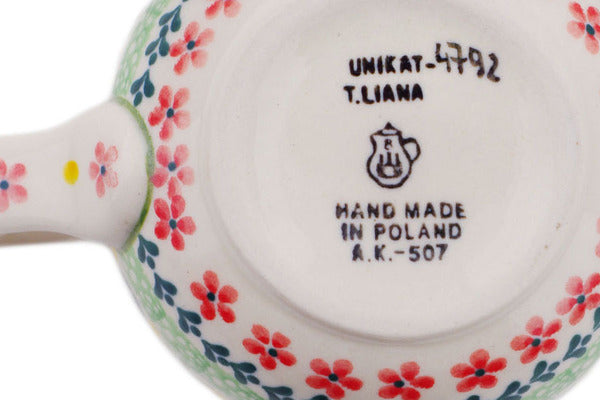 This Polish pottery Bubble Mug is made by Ceramika Artystyczna workshop in Boleslawiec, Poland. Manufacturer item number H0894Q. It is 3¼" high and measures 4¼" by 3¼". The capacity of this Bubble Mug is 8.0 oz when filled to rim and it weighs 0.5 lbs. The pattern was designed by artist Teresa Liana. It is part of the Spring Bliss Collection.