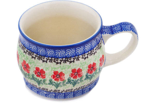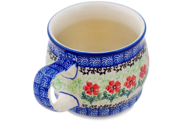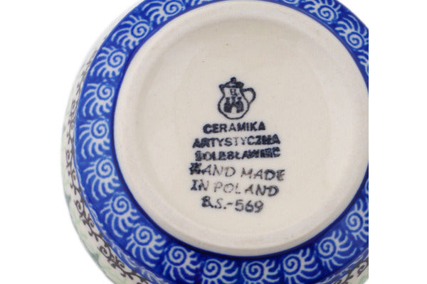 This Polish pottery Cup is made by Ceramika Artystyczna workshop in Boleslawiec, Poland. Manufacturer item number H1512Q. It is 2½" high and measures 5" by 4¼". The capacity of this Cup is 7.7 oz when filled to rim and it weighs 0.6 lbs. The pattern was designed by artist Irena Mączka. It is part of the Maraschino Collection.