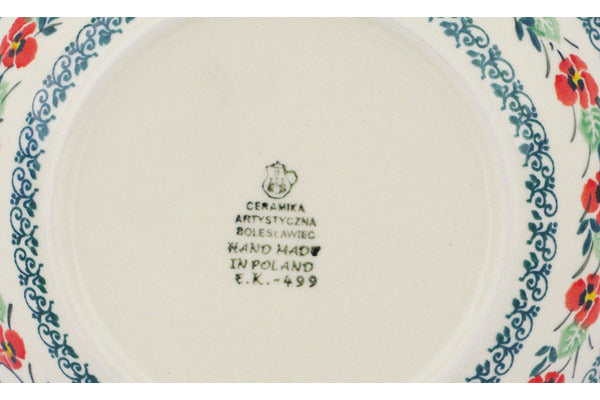 This Polish pottery Pasta Bowl is made by Ceramika Artystyczna workshop in Boleslawiec, Poland. Manufacturer item number H9871Q. It is 1¾" high and measures 8¼" by 8¼". The capacity of this Pasta Bowl is 22.5 oz when filled to rim and it weighs 1.2 lbs. It is part of the Red Pansy Collection.