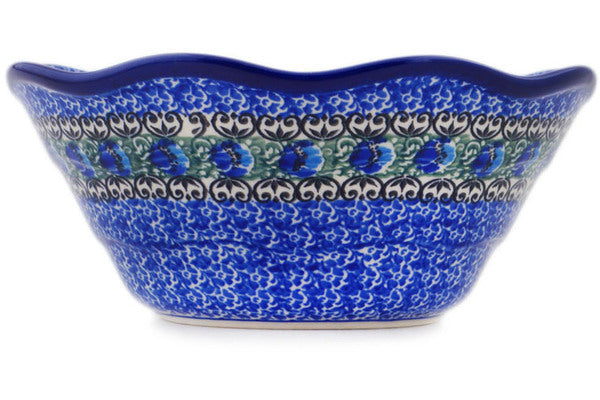 This Polish pottery Scalloped Bowl is made by Ceramika Artystyczna workshop in Boleslawiec, Poland. Manufacturer item number H5397Q. It is 3½" high and measures 8" by 8". The capacity of this Scalloped Bowl is 41.3 oz when filled to rim and it weighs 1.5 lbs. The pattern was designed by artist Teresa Liana. It is part of the Peacock Feather Collection.