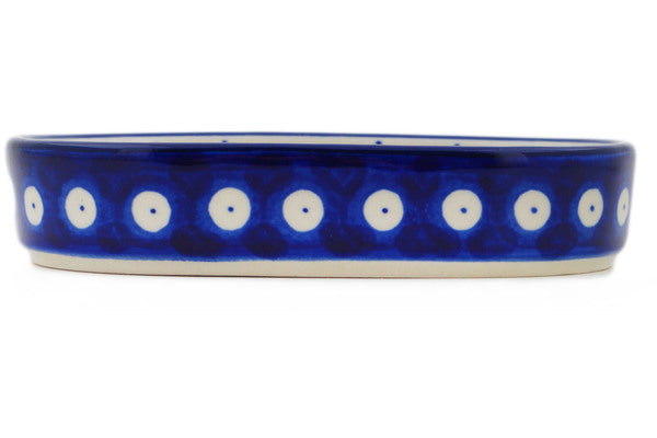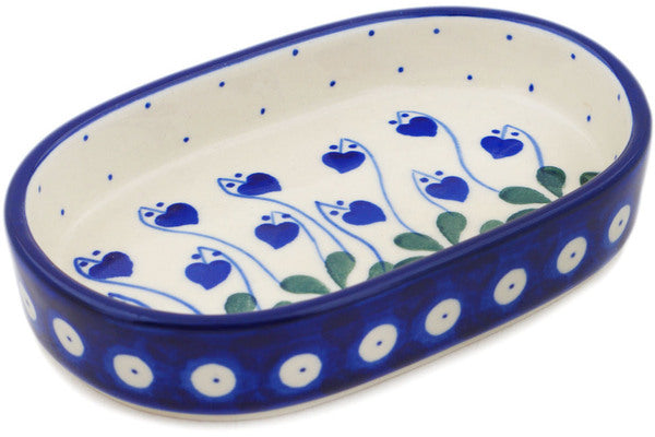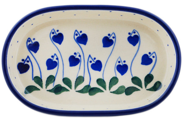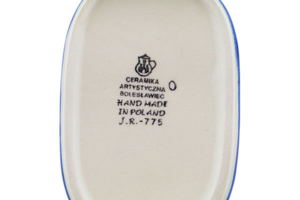 This Polish pottery Tray is made by Ceramika Artystyczna workshop in Boleslawiec, Poland. Manufacturer item number H0665R. It is 1" high and measures 8" by 3¾". The weight of this Tray is 0.8 lbs. The pattern was designed by artist Maria Ciszewska. It is part of the Bleeding Heart Peacock Collection.