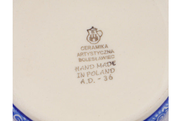 This Polish pottery Utensil Jar is made by Ceramika Artystyczna workshop in Boleslawiec, Poland. Manufacturer item number H5102Q. It is 7¾" high and measures 5¼" by 5¼". The capacity of this Utensil Jar is 50.7 oz when filled to rim and it weighs 3.3 lbs. The pattern was designed by artist Maria Starzyk. It is part of the Blue Bud Sea Collection.