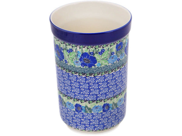 This Polish pottery Utensil Jar is made by Ceramika Artystyczna workshop in Boleslawiec, Poland. Manufacturer item number H6917Q. It is 7¾" high and measures 5¼" by 5¼". The capacity of this Utensil Jar is 50.7 oz when filled to rim and it weighs 3.3 lbs. The pattern was designed by artist Maria Starzyk. It is part of the Moody Blues Collection.