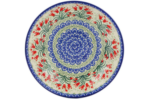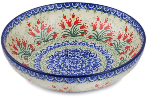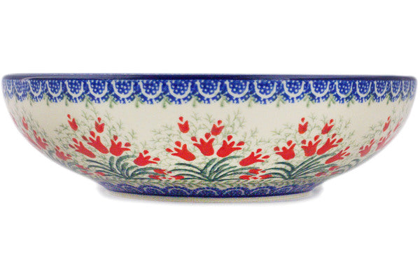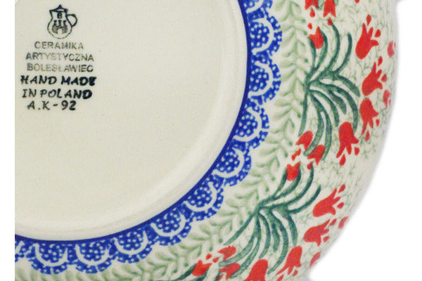 This Polish pottery Bowl is made by Ceramika Artystyczna workshop in Boleslawiec, Poland. Manufacturer item number H5526Q. It is 2¾" high and measures 8¾" by 8¾". The weight of this Bowl is 2.2 lbs. The pattern was designed by artist Jolanta Okraska. It is part of the Crimson Bells Collection.