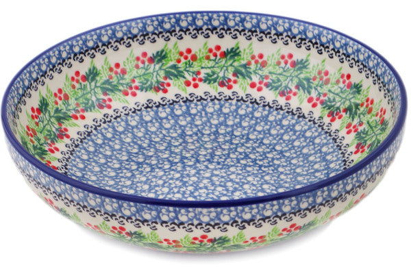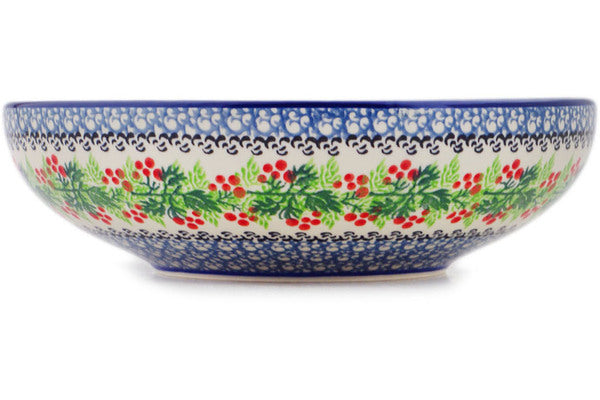 This Polish pottery Bowl is made by Ceramika Artystyczna workshop in Boleslawiec, Poland. Manufacturer item number H5266Q. It is 2¾" high and measures 8¾" by 8¾". The weight of this Bowl is 2.2 lbs. The pattern was designed by artist Wirginia Cebrowska. It is part of the Holly Berry Wreath Collection.