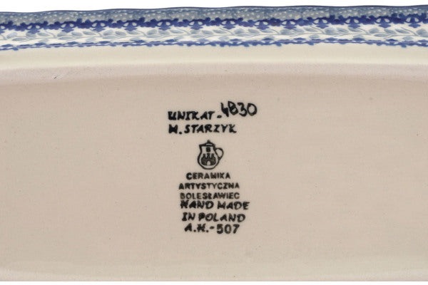 This Polish pottery Butter Dish is made by Ceramika Artystyczna workshop in Boleslawiec, Poland. Manufacturer item number H4015K. It is 3½" high and measures 9" by 4¾". The weight of this Butter Dish is 2.0 lbs. The pattern was designed by artist Maria Starzyk. It is part of the Waiting Birds Collection.