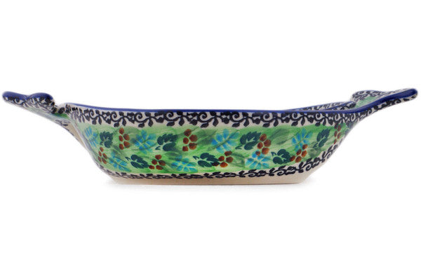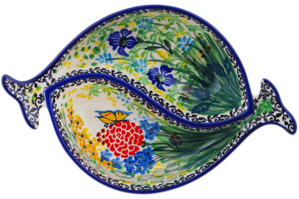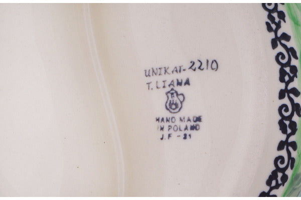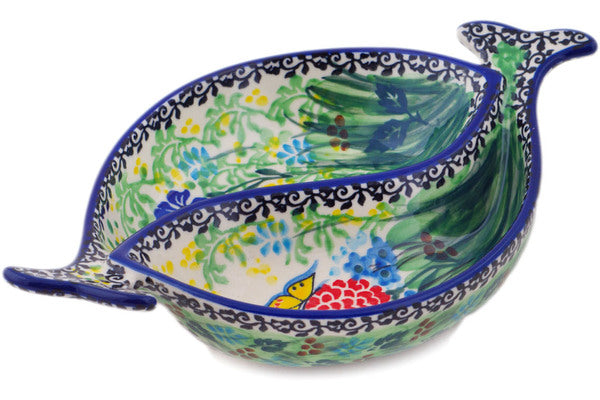 This Polish pottery Divided Dish is made by Ceramika Artystyczna workshop in Boleslawiec, Poland. Manufacturer item number H6633Q. It is 1¾" high and measures 9" by 6". The capacity of this Divided Dish is 8.7 oz when filled to rim and it weighs 1.1 lbs. The pattern was designed by artist Teresa Liana. It is part of the Spring Garden Collection.