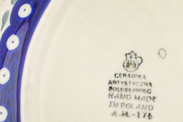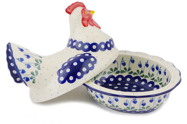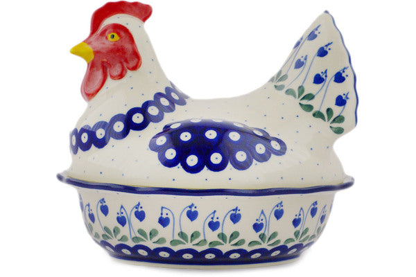 This Polish pottery Hen Shaped Jar is made by Ceramika Artystyczna workshop in Boleslawiec, Poland. Manufacturer item number H9909Q. It is 8" high and measures 9½" by 8". The capacity of this Hen Shaped Jar is 31.8 oz when filled to rim and it weighs 4.2 lbs. The pattern was designed by artist Maria Ciszewska. It is part of the Bleeding Heart Peacock Collection.