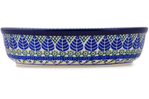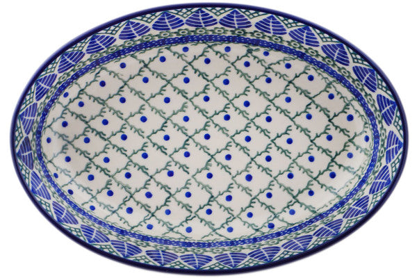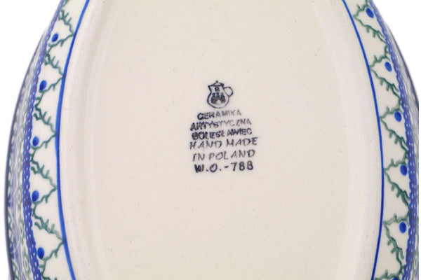 This Polish pottery Oval Baker is made by Ceramika Artystyczna workshop in Boleslawiec, Poland. Manufacturer item number H5065Q. It is 2¼" high and measures 9½" by 6¼". The capacity of this Oval Baker is 34.1 oz when filled to rim and it weighs 1.5 lbs. The pattern was designed by artist Teresa Liana. It is part of the Blue Alpine Collection.