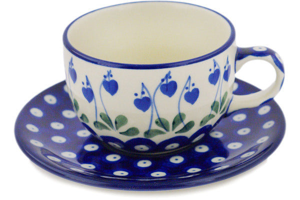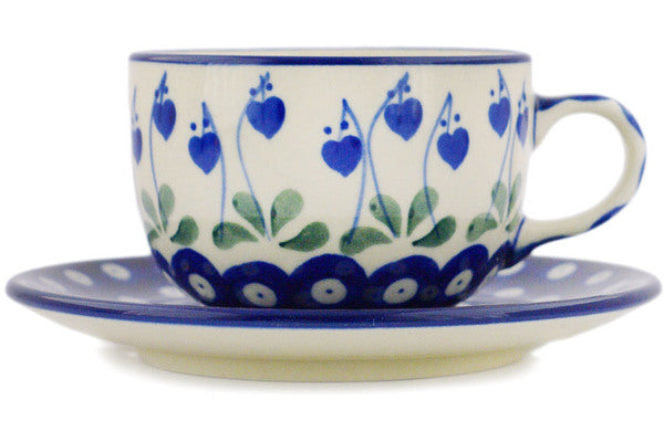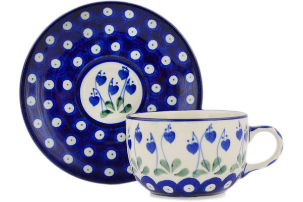 Polish Pottery 9 oz Cup with Saucer Bleeding Heart Peacock