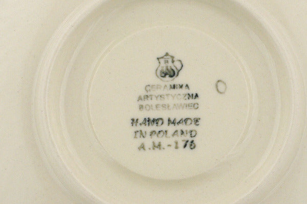 This Polish pottery Cup with Saucer is made by Ceramika Artystyczna workshop in Boleslawiec, Poland. Manufacturer item number H9897Q. It is 3" high and measures 6" by 6". The capacity of this Cup with Saucer is 9.3 oz when filled to rim and it weighs 1.1 lbs. The pattern was designed by artist Maria Ciszewska. It is part of the Bleeding Heart Peacock Collection.
