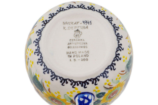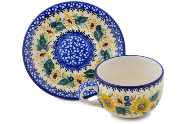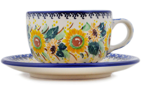 This Polish pottery Cup with Saucer is made by Ceramika Artystyczna workshop in Boleslawiec, Poland. Manufacturer item number H2342Q. It is 3" high and measures 6" by 6". The capacity of this Cup with Saucer is 9.3 oz when filled to rim and it weighs 1.1 lbs. The pattern was designed by artist Krystyna Deptuła. It is part of the Sunflowers At Sunset Collection.