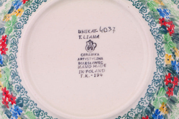 This Polish pottery Pasta Bowl is made by Ceramika Artystyczna workshop in Boleslawiec, Poland. Manufacturer item number H3788Q. It is 1¾" high and measures 9½" by 9½". The capacity of this Pasta Bowl is 11.8 oz when filled to rim and it weighs 1.5 lbs. The pattern was designed by artist Teresa Liana. It is part of the Delightful Garden House Collection.