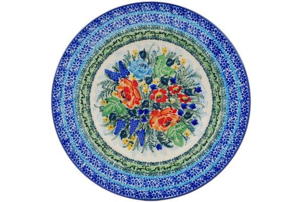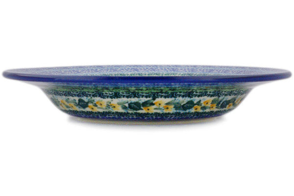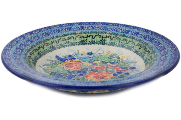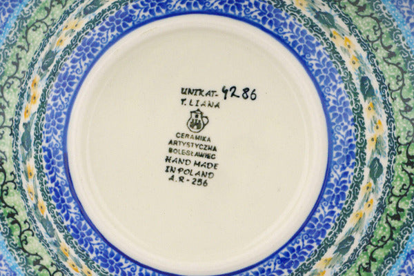 This Polish pottery Pasta Bowl is made by Ceramika Artystyczna workshop in Boleslawiec, Poland. Manufacturer item number H8089Q. It is 1¾" high and measures 9½" by 9½". The capacity of this Pasta Bowl is 11.8 oz when filled to rim and it weighs 1.5 lbs. The pattern was designed by artist Teresa Liana. It is part of the Fiery Meadow Collection.