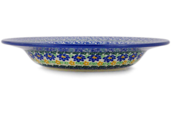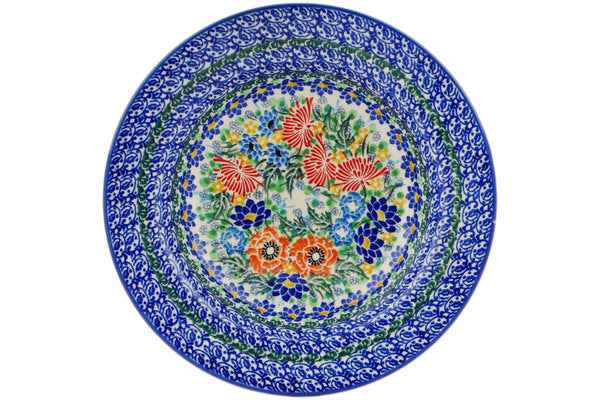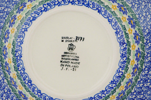 This Polish pottery Pasta Bowl is made by Ceramika Artystyczna workshop in Boleslawiec, Poland. Manufacturer item number H8028Q. It is 1¾" high and measures 9½" by 9½". The capacity of this Pasta Bowl is 11.8 oz when filled to rim and it weighs 1.5 lbs. The pattern was designed by artist Maria Starzyk. It is part of the Loropetalum Garden Collection.
