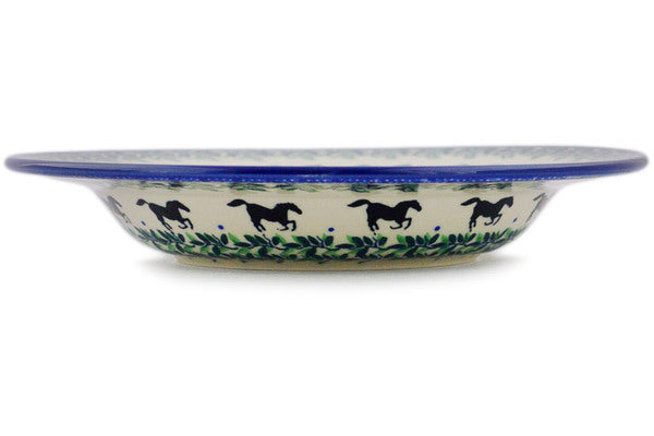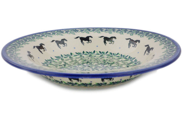This Polish pottery Pasta Bowl is made by Ceramika Artystyczna workshop in Boleslawiec, Poland. Manufacturer item number H3389R. It is 1¾" high and measures 9½" by 9½". The capacity of this Pasta Bowl is 11.8 oz when filled to rim and it weighs 1.5 lbs. It is part of the Mustang Forest Collection.