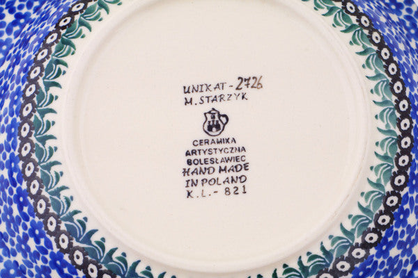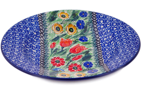 This Polish pottery Pasta Bowl is made by Ceramika Artystyczna workshop in Boleslawiec, Poland. Manufacturer item number H3751Q. It is 1¾" high and measures 9½" by 9½". The capacity of this Pasta Bowl is 11.8 oz when filled to rim and it weighs 1.5 lbs. The pattern was designed by artist Maria Starzyk. It is part of the Wildflower Path Collection.