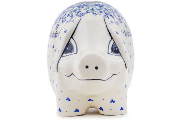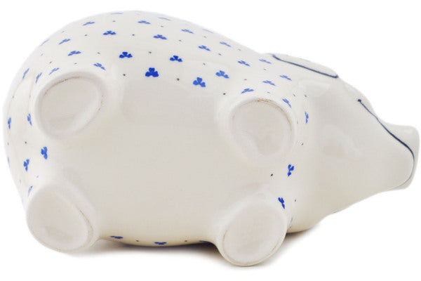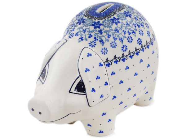 This Polish pottery Piggy Bank is made by Ceramika Artystyczna workshop in Boleslawiec, Poland. Manufacturer item number H0347Q. It is 6½" high and measures 9½" by 5". The weight of this Piggy Bank is 2.5 lbs. The pattern was designed by artist Maria Starzyk. It is part of the Blue Country Field Collection.