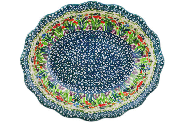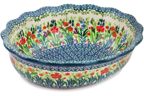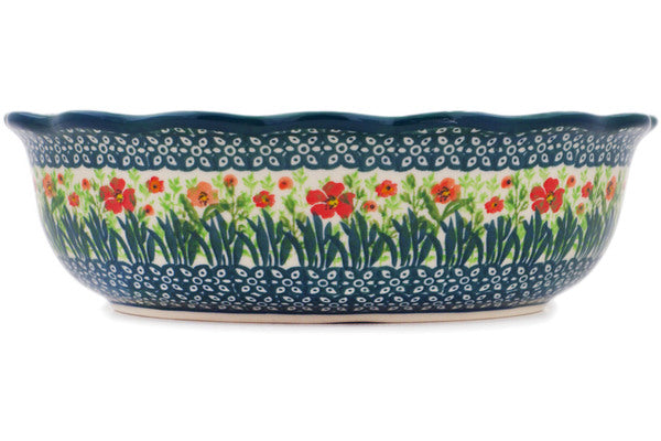 This Polish pottery Scalloped Bowl is made by Ceramika Artystyczna workshop in Boleslawiec, Poland. Manufacturer item number H6840Q. It is 2¾" high and measures 9¼" by 7¾". The capacity of this Scalloped Bowl is 76.7 oz when filled to rim and it weighs 0.3 lbs. The pattern was designed by artist Krystyna Dacyszyn. It is part of the Red Garden Collection.
