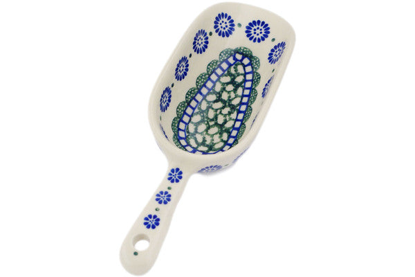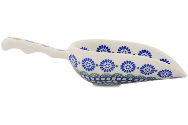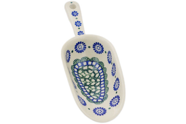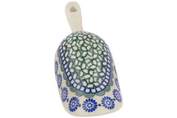 This Polish pottery Scoop is made by Ceramika Artystyczna workshop in Boleslawiec, Poland. Manufacturer item number H5627Q. It is 2" high and measures 9" by 3". The weight of this Scoop is 0.5 lbs. The pattern was designed by artist Teresa Liana. It is part of the Maia Collection.