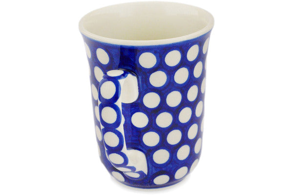 This Polish pottery Mug is made by Ceramika Artystyczna workshop in Boleslawiec, Poland. Manufacturer item number H6217R. It is 5" high and measures 5" by 4". The capacity of this Mug is 17.4 oz when filled to rim and it weighs 1.1 lbs. The pattern was designed by artist Starzyk.