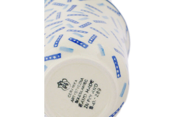 This Polish pottery Mug is made by Ceramika Artystyczna workshop in Boleslawiec, Poland. Manufacturer item number H7462Q. It is 5" high and measures 5" by 4". The capacity of this Mug is 17.4 oz when filled to rim and it weighs 1.1 lbs.