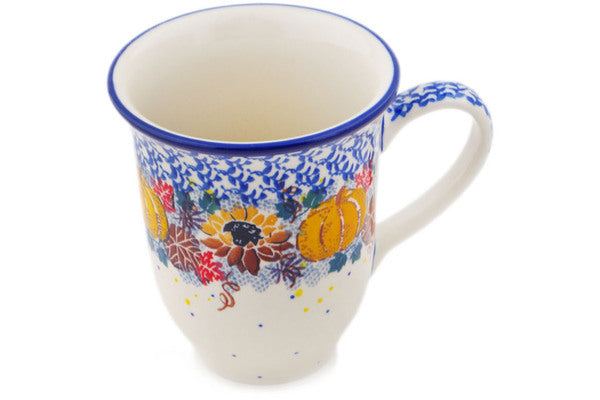 This Polish pottery Mug is made by Ceramika Artystyczna workshop in Boleslawiec, Poland. Manufacturer item number H6977Q. It is 4¾" high and measures 5½" by 4¼". The capacity of this Mug is 16.6 oz when filled to rim and it weighs 1.1 lbs. The pattern was designed by artist Maria Starzyk. It is part of the Autumn Falling Leaves Collection.